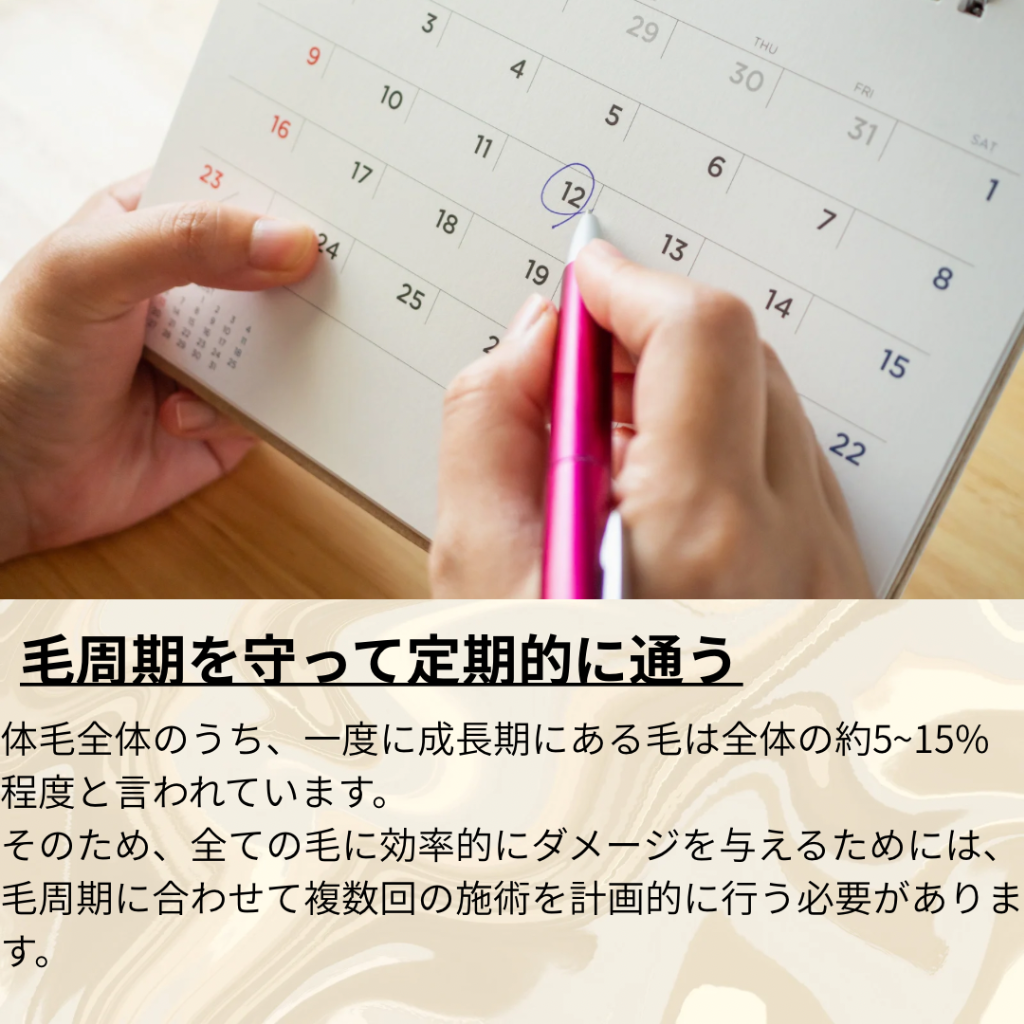 まずは効率的に進めるため、毛周期を守って定期的に通いましょう💡成長期の毛に光を当てることで効果が高まります❗️