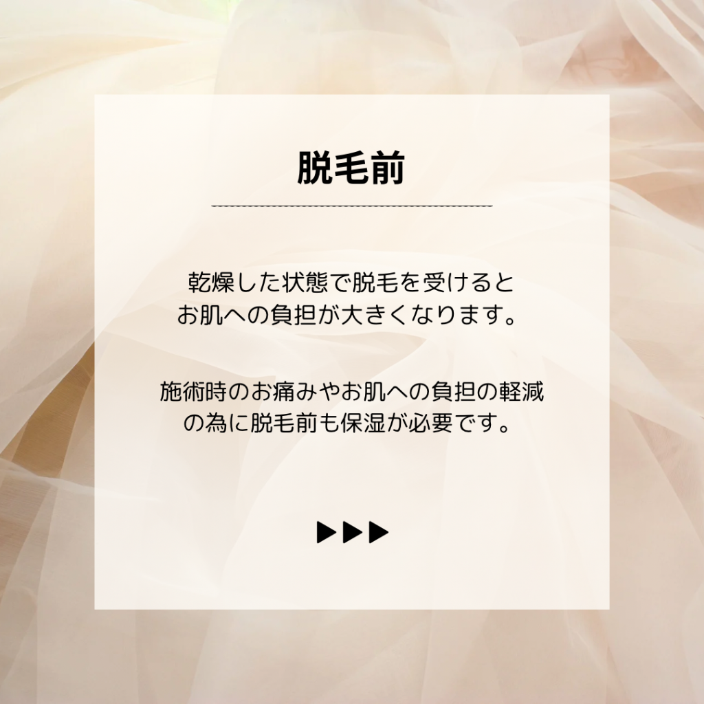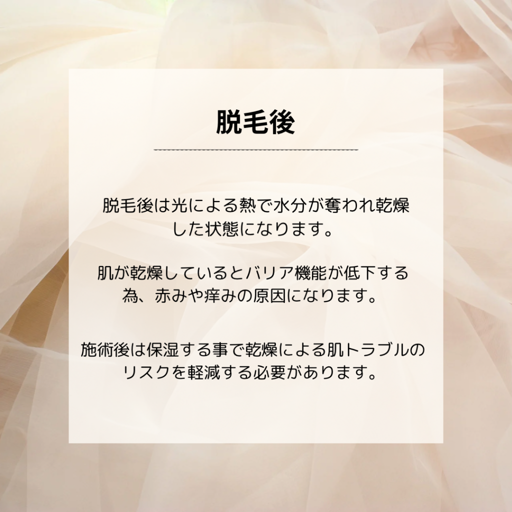 乾燥した状態が続くと皮膚が硬くなるので、毛が抜けにくくなり充分な効果が期待出来なくなります🌀